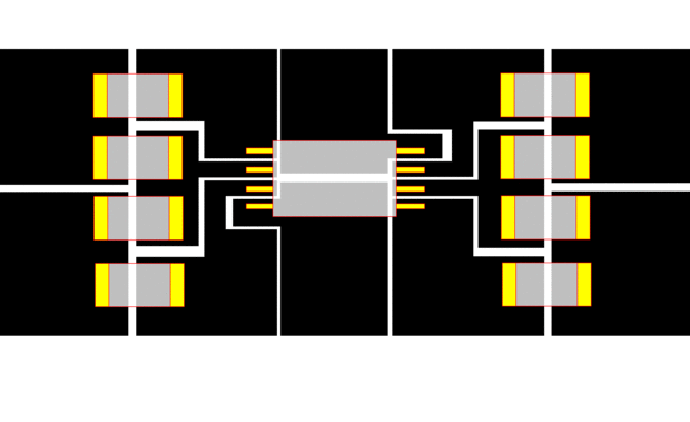 En el diseño siguiente, negro representa repesents cobre, blanco las zonas donde el cobre tiene que ser eliminado, y gris y amarillo representan el cuerpo de componente y conduce respectivamente.