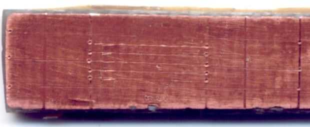 Un pequeño trozo de tablero de doble cara epoxy revestido cobre fue cortado a la medida y limpia. Marcas de referencia fueron perforadas en él así que cuando cubre con una capa de tinta del marcador estos todavía será visible. Las líneas y marcas de punzón no corte el cobre, sangrar a la superficie lo suficiente como para marcar en relieve.