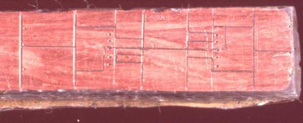 Esas líneas se anotaron en el cobre como un guía y restos de cobre en algunas partes. También se puede ver que restos de cobre en algunos lugares cerca del borde del tablero, esto es intencional y está diseñado para que la corriente tiene un camino para viajar a todas las partes de la Junta para que la electrólisis puede proceder.