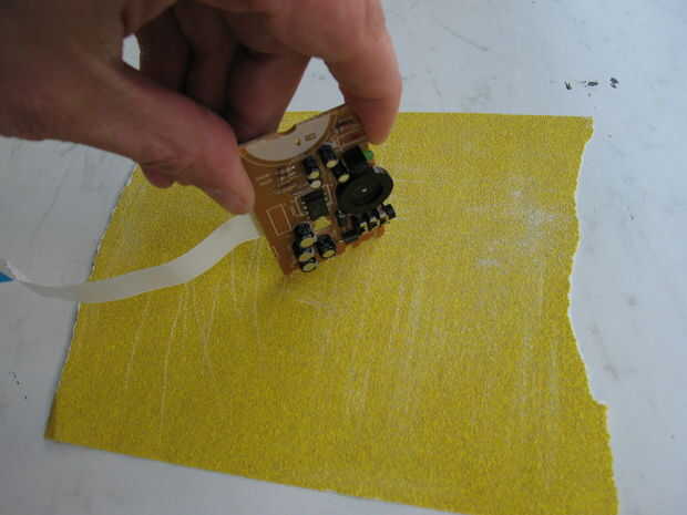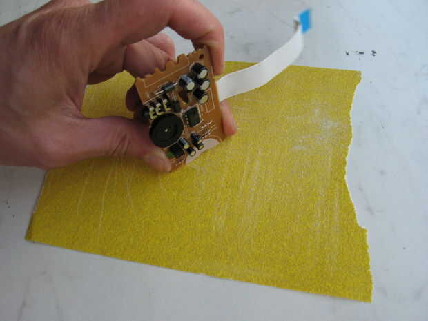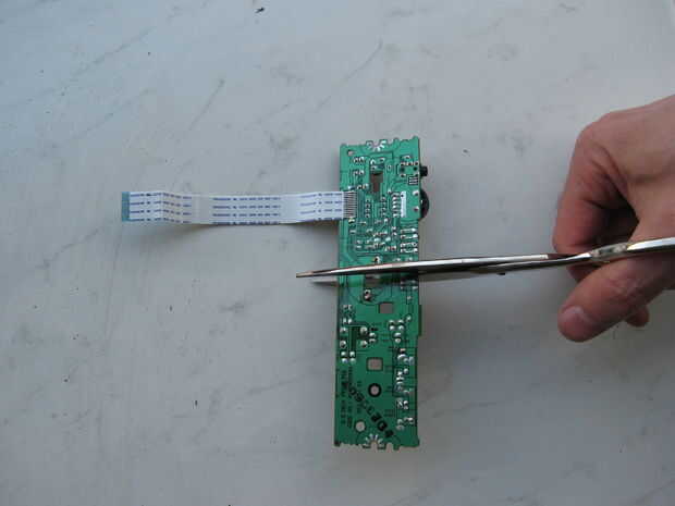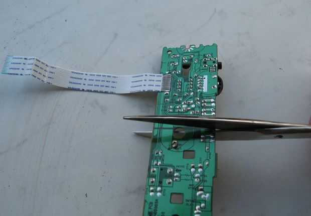 La siguiente acción es para marcar la parte de la Junta que se debe utilizar, de manera que los recorridos de la señal y fuente para las pistas de audio amp deben mantenerse seguras. Siempre hay algunas pistas que conectan interruptores, sensores, LED colocado en la otra parte de la Junta y sin ninguna influencia en el rendimiento del amplificador de audio se puede cortar. Para la marca usé un marcador oscuro. Ahora se puede cortar la placa. Para ello utilizo tijeras habituales. Tienes que cortar el tablero con cuidado a cierta distancia de la línea del marcador - debido a las grietas, que aparecen durante el corte. Después de cortar el tablero, debe ser formado - todos filos deben ser pulido. Para ello puede utilizarse un papel de lija.