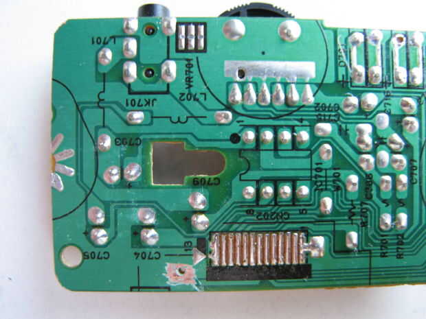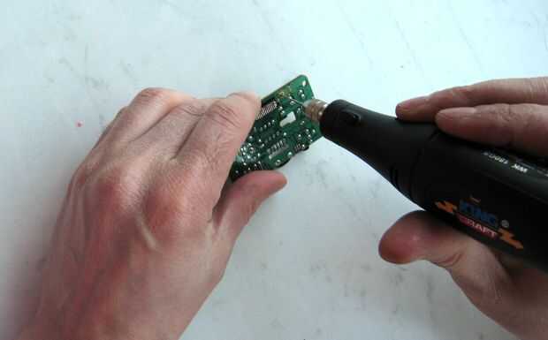 Vamos a empezar con el conector de tierra - la tierra es normalmente el cable "más gordo" en la PCB. Es chip pin #4.Using óhmetro puede comprobarlo. Un lugar adecuado donde el cable de tierra ("-" de la batería) deberá ser soldada debe ser encontrado. Allí la falta de verde debe retirarse el PCB. Rasguño usando una aguja grande. Allí debe perforarse un orificio para el cable de tierra.