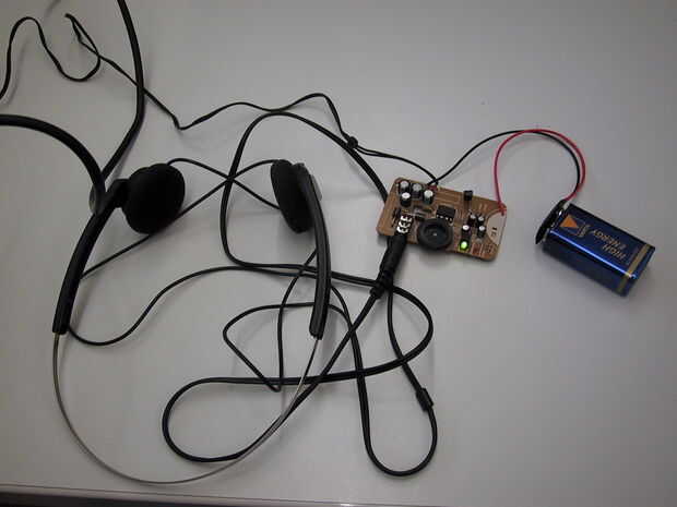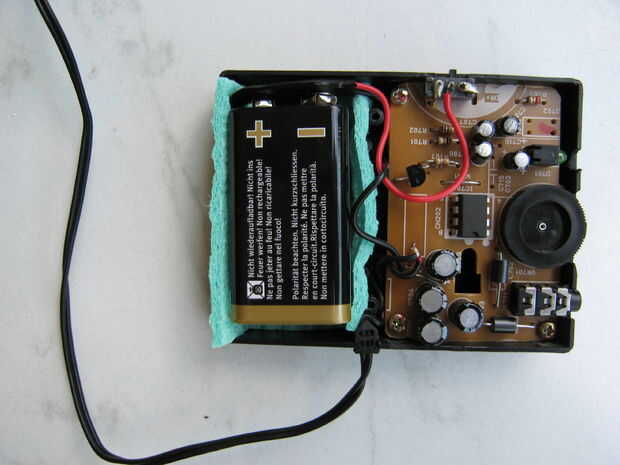 Utilicé una caja de plástico apto para pequeña radio, donde un lugar especial para el 9V batería (6LR61type) era reservada. He añadido un micro interruptor en el cable de la batería "+". Corté un agujeros en la pared lateral de la caja para el control de volumen, conector de sonido, el LED y la perilla del interruptor micro usando una dremel como herramienta. Por fin he arreglado el tablero mediante 3 tornillos pequeños.