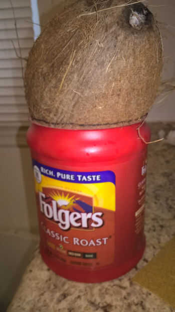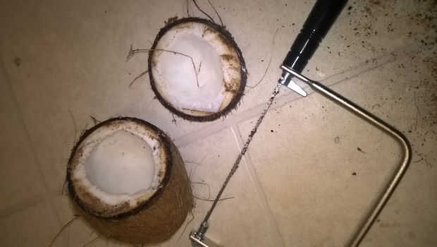 La cáscara se debe cortar para que pueda sentarse sobre una base plana. Usted notará que el coco tiene 3 "ojos". Uno de ellos es mucho más suave que el otro. Destornillador de estrella yo solía golpear a través de él y vaciar la leche. La cáscara se coloca en una lata de café pequeña con 3 ojos apuntando hacia arriba, y una línea fue dibujada alrededor para definir un plano. La cáscara fue cortada con cuidado siguiendo la línea con una sierra de marquetería. La cáscara es muy dura, pero corte a través de él va rápidamente con un nuevo disco.