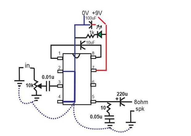 Aquí es un circuito amplificador LM386. Los pines 1 y 8 ajuste la ganancia del amplificador. Dejándolos abiertos resultados en un aumento de los set de 20. Los puentes con un condensador de 10uF, como se muestra aquí, los resultados en la ganancia máxima de 200. A ganancia = 200, la viruta produce un sonido que se distorsiona mucho (una manera fresca y musical). Estoy construyendo este uno para guitarra y decidió establecer permanentemente la ganancia en el tablero. Potenciómetro 5 k se puede utilizar, para una ganancia ajustable (como en este circuito http://makezine.com/projects/make-09/the-5-cracke... ), o mediante la adición de un resistor en serie con el condensador de 10uF para bajar la ganancia. Si necesita un sonido más limpio, el LM386 no es una gran opción. Un amplificador de TDA052 (como un amplificador de "Punch", o uno como este http://makezine.com/projects/make-09/the-5-cracke...) es más fuerte y limpio.