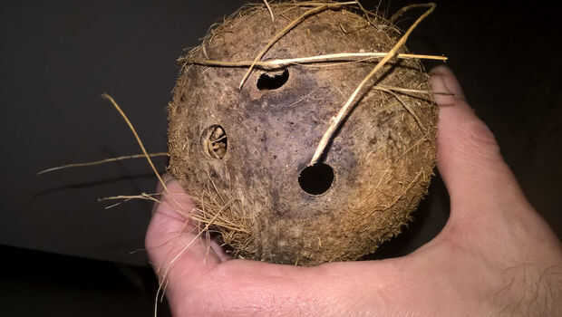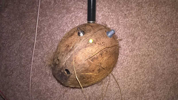 Taladró los "ojos" con una broca de 3/8". Esto actúa como una especie de parrilla del altavoz, y se ve tipo de fresco. El propósito real del dispositivo no es inmediatamente evidente. Taladré orificios para el interruptor y LED al lado del otro y el phono jack y volumen perilla al lado de uno (hacia la parte posterior). Burlaba arriba, asegurándose de que todo encajaría. El orador fue instalado por pegando (con 3 gotas de pegamento epóxico) en el interior, detrás de los 3 ojos. El LED, interruptor, pote y jack fueron instalados, y finalmente la placa de circuito era epoxy pegada al lado. No es fácil fijar las piezas en su lugar para curar, así que terminé sujetándolas con las manos para una buena 10 minutos hasta que el pegamento lo suficientemente sólido para mantenerlo.