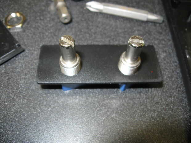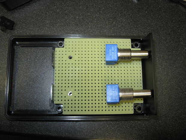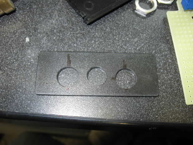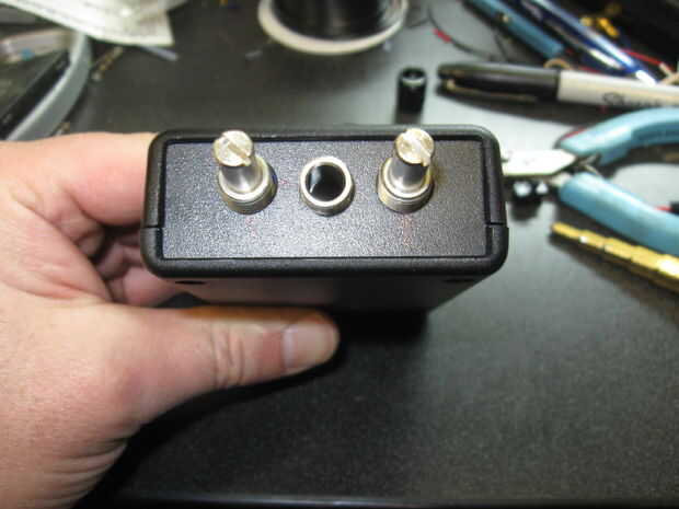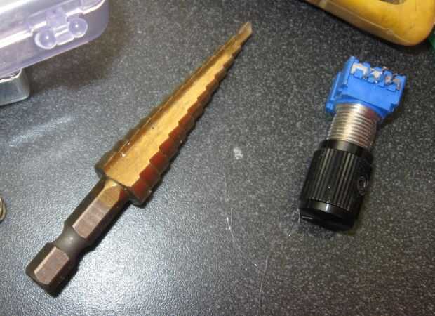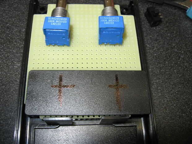 Coloque los botes que unos espacios atrás pero todavía en consonancia con la posición deseada. marca el centro de cada eje del pote y luego taladro con una broca de paso a más estrechos ajuste tamaño del agujero. Marque con un centro entre los baches y taladro para el conector estéreo