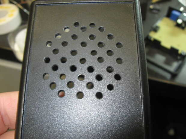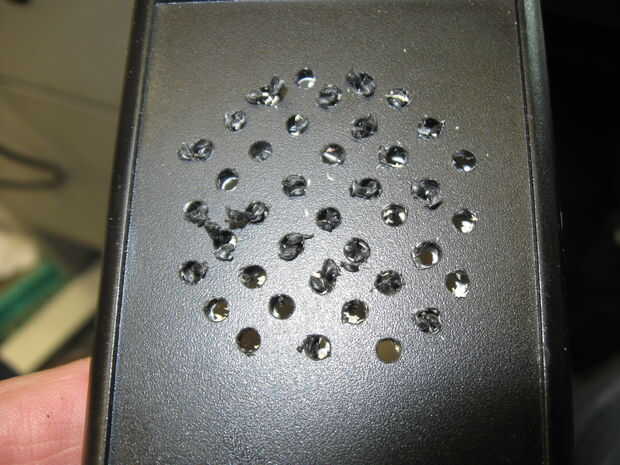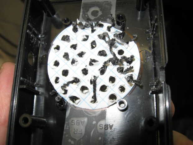 La plantilla en el interior de la cubierta de la cinta como se muestra a continuación, utilice una broca de paso para perforar en el centro de cada cuadrado de la cuadrícula. Esto formará la rejilla del altavoz. limpiar los orificios.