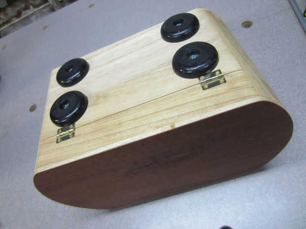 A continuación instale las patas de goma. He decidido ponerlos en el lado con bisagras, porque cuando el cerrojo se abre, la puerta permanece parcialmente entornado, dando la opción de tener ya sea cerrado o gabinete con respaldo abierto.