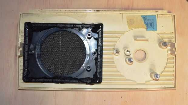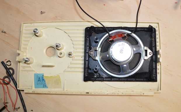 1. Retire la cubierta del altavoz del amplificador. Necesitará este pegamento abajo en la parte posterior de la radio donde fue el orador original. Usé pegamento usado.