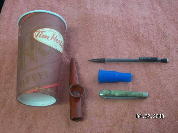 Usted necesitará un kazoo, (que no resultarán dañado), una taza de café de papel y algunas herramientas, en la foto a continuación.
