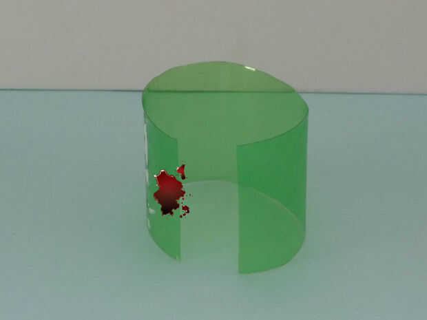 Luego estirar la mitad de la botella sobre la mesa y poner pegamento caliente (importante:el pegamento caliente no puede estar demasiado caliente porque deformirá el plástico) en un extremo de la mitad de la botella y la cola en forma de tubo que es más pequeño que el diámetro de la parte inferior de la botella que espero no tirar a la basura (no estoy diciendo que deberías trow de plástico en el piso - sabes toma muchos muchos años a deteriorarse). La limpieza de la sangre.