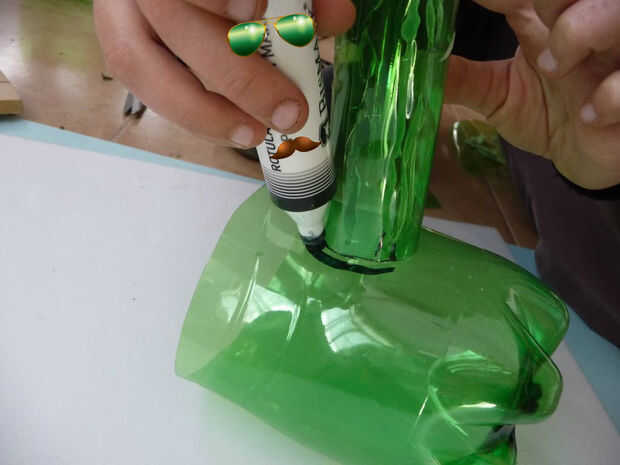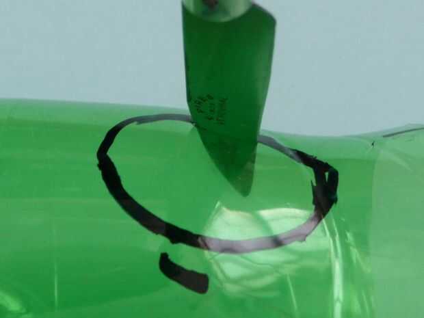 Vas a utilizar el marcador por la vez última sosteniendo el tubo de plástico contra el lado de la parte inferior de la botella y dibujo alrededor del tubo plástico. Cortan a través de las líneas. Repita el proceso con la otra botella.