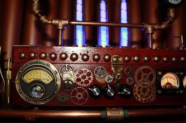 Oh, y engañé. El amplificador sí mismo es comprado de tienda. Sinceramente, esto es más de a cómo construir una vivienda de steampunk para un amplificador con algunas características extra en el lado.