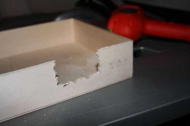 Asegúrese de que fondo arena cualquier asperezas de corte ligeramente el resto de la caja para preparar para la aplicación de la mancha de arena y acabado. Si cualquiera de la perforación y el corte del agujero pasado a romper o astillar la madera (y será), puede cubrir la mayoría de las imperfecciones con masilla de madera. Una vez teñidos, son apenas sensibles. Honesta... Pero a menos que el astillar madera es grave, no tire la caja y comenzar de nuevo. Esta madera barata, o lo que sea, algunos no importa lo que hagas se astilla.