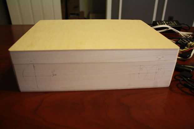 El cuadro que estoy usando he comprado de Amazon. Era una caja de madera sin terminar muy básica de exactamente el tamaño correcto que necesitaba para el amplificador y otros componentes. Dicho esto, este cuadro resultó para ser un poco en el lado débil. La descripción dice es tilo, pero era más como de madera contrachapada o cartón prensado. Casi arrancó la cosa por tratar de hacer agujeros en ella. No tenía ninguna traba, y las bisagras que vino con eran terribles, que fue así porque tenía que quitar de todas formas para aplicar el tinte y acabado. Acabo de comprar unas bisagras mejor y una pequeña traba para sujetar durante un paso posterior. También verá en algunas de las fotos que la madera se divide en varios lugares. Así que por favor siéntase libre encontrar una caja mejor, o crear tu propio si tienes esas habilidades.