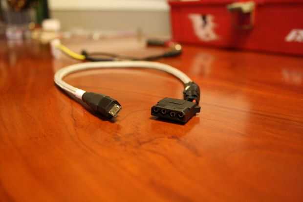 La razón pensé que necesitaría otro ladrillo de la energía para la iluminación era que las luces necesario no 5V 12V y la potencia de la batería tipo brick es solo 12V con ninguna salida de 5V obvio. Sé que es posible tornándolos 12V a 5V, pero otra vez, no soy experto en esto. Sin embargo, el amplificador sí mismo tiene un micro-USB hacia fuera, y eso significa 5V está disponible. Para obtener energía desde el enchufe micro USB en la parte posterior del amplificador a las luces, se necesita un micro-USB de 5V adaptador molex 4-pin, que se ha descrito anteriormente.