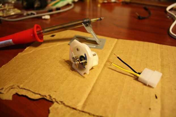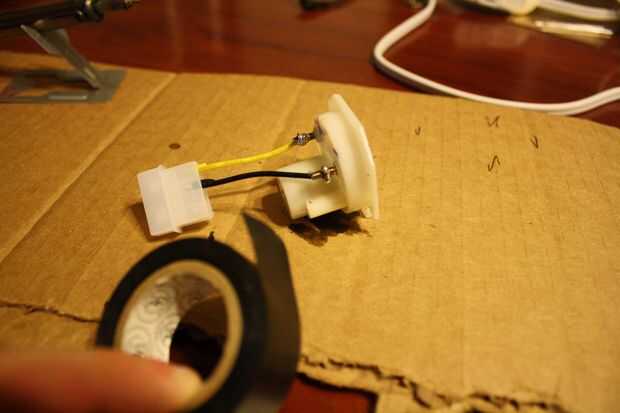 Tome un cable 12V de molex (4 pines molex macho con sólo los cables amarillo y negro) y corte los cables a unos dos o tres pulgadas. Pele los extremos de los cables y soldarlos a los cables en la parte posterior del voltímetro, amarillo al positivo y negro al negativo. Asegúrese de envolver los puntos de soldadura en cinta aislante. Ahora puede conectar el molex macho del voltímetro a lo molex hembra de molex Y-divisor que se utilizará para alimentar todos los componentes de molex alimentado de 12V.