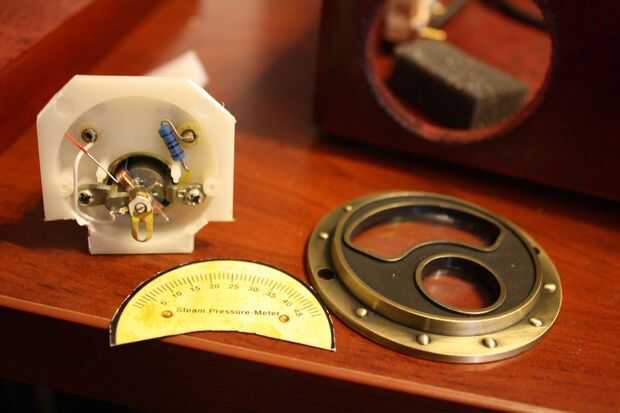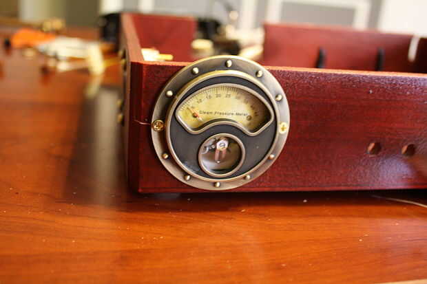 Una vez hecho esto, usted puede asegurar el voltímetro dentro del agujero de 2 pulgadas en el lado izquierdo (que terminó completamente la cinta en su lugar, como he no podido encontrar ningún punto de tornillo realizable). Entonces introduzca un recorte de un vapor de calibre en lugar de la placa calibradora aburrido del voltímetro y fije la placa de latón calibre overtop. Tengo la placa frontal del calibrador fuera de eBay, a un vendedor llamado timolney que se les hace. El calibre que me vendieron vino con varios recortes de placa frontal agradable, de que se trataba de uno.