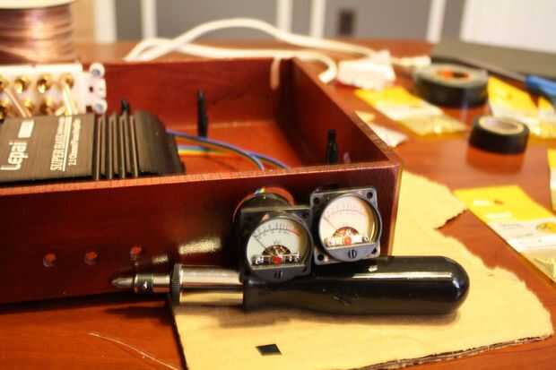 Una vez que el tablero de conductor del VU y vúmetros estén funcionando, puede instalarlos. Me pareció más fácil de instalar los medidores de VU primero en los dos agujeros de corte en el lado derecho, simplemente los revestimiento en su lugar y luego fijándolos con tornillos. Se puede montar en el exterior, como hice yo, o desde el interior si desea que aparezcan más empotrado (que es una cuestión de preferencia). El tablero debe montarse detrás de los metros, fijados a la parte inferior de la caja por sus dos agujeros. Pongo un poco de espuma debajo de protección adicional. Una vez que todo esté en su lugar y aprieta hacia abajo, usted probablemente debe comprobar para asegurarse de que la Junta Directiva y metros todavía están trabajando.