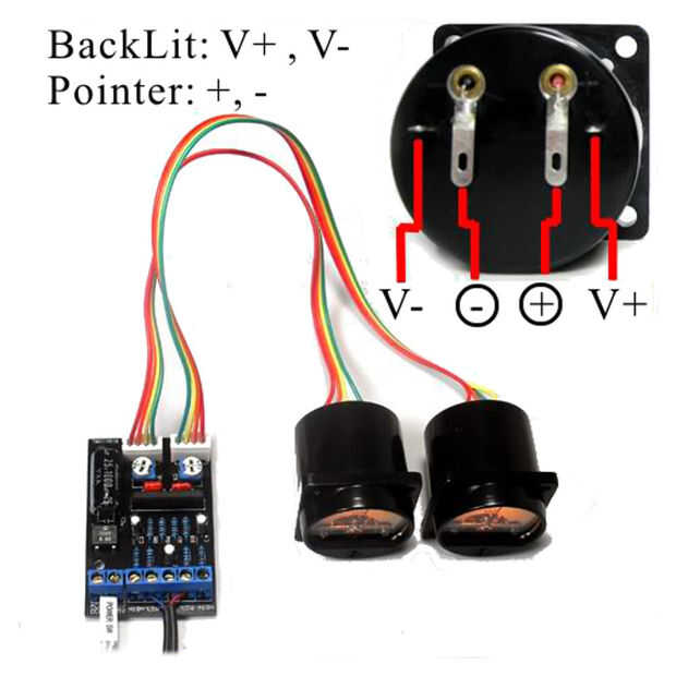 Yo debo pedir disculpas en este momento como no tomo fotos de cableado del tablero de conductor del VU los medidores de VU. Sin embargo, he incluido un cuadro de referencia que encontré que muestra cómo deben conectarse los cables (es un Consejo un poco diferente, pero las conexiones son idénticas). Básicamente, dos de los cables son para el puntero del medidor y los otros dos cables son para alimentar la luz. Conectarlos y soldarlos en el lugar como se muestra en el diagrama, luego cubrir con cinta aislante para evitar cualquier cortos.