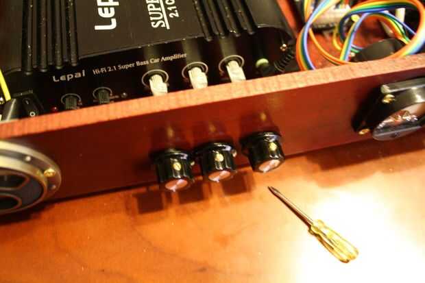Como se puede ver en las imágenes, los botones pequeños del amplificador tienen una muesca. No sé lo que realmente es esa muesca para, pero encontré que por prensar el tubo de aluminio, podía cuña y usar la longitud de tubería de aluminio como un extensor para gire las perillas (ver imagen). Esto era muy práctico, puesto que no era posible para mí conseguir la descarga del receptor contra la cara de la caja. Sin esto, no hubiera tenido alguna forma de acceder a los bajos, agudos y controles de volumen. Verás dos otras perillas este amplificador que no doy con ello. Ésos son volumen del subwoofer y crossover, que rara vez necesita ser ajustado. Además, carecían de la muesca práctica, por lo que sólo dejé solo. Yo también no hizo nada sobre el interruptor de alimentación del amplificador, ya que estoy controlando el poder desde el interruptor.
