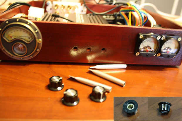 Las perillas de control de agudos, graves y volumen son fáciles de colocar, suponiendo que los agujeros que ha perforado, de hecho, alineado con la marca del amplificador. Si nos fijamos en las imágenes, verá tengo tres mandos y tres longitudes cortas de tubería metálica de corte y doblado en un extremo. Las perillas se son los comunes radio mandos en RadioShacks en todas partes, por lo menos, hasta que salió del vientre de arriba. He incluido fotos de la parte posterior y lateral de uno de los botones para que pueda ver cómo el pequeño tubo metálico debe ser empujado dentro del agujero en la parte posterior y asegurado en su lugar con el tornillo pequeño en el lado de la perilla. Usted puede encontrar mejor las perillas o botones que son más steampunk en apariencia, pero no he podido encontrar ningún botones mejor que ajusten al tamaño exacto que necesitaba y que podría fijarse la forma que necesitaba para adjuntar.