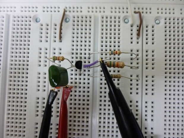 Así que ahora permite empezar a construir la cosa! El más eficiente y libre manera de hacerlo sería dejar todos los conectores hasta el final. Comenzando con el transistor y las resistencias, el circuito parece fácil suficiente para que wont intenta guiarlo a través de él. Una vez hecha esta base, el generador de funciones (parte inferior izquierda en rojo y negro) se puede conectar y luego de la salida (que se muestra aquí como el cable morado conectado a una sonda).