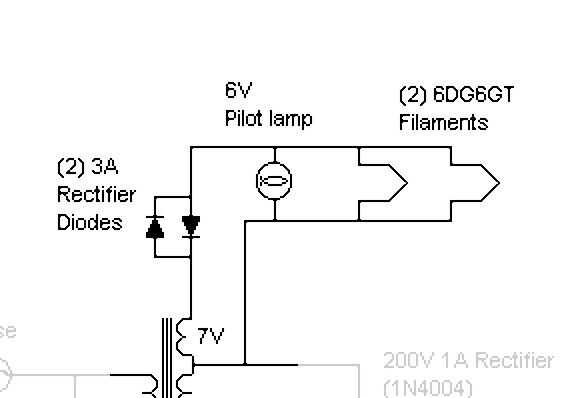 Colocar dos diodos grandes en paralelo pero enfrente de direcciones en una fuente de CA limita el voltaje por la cantidad de caída de tensión (5 a .7V), al igual que un diodo en una fuente de CC. Que bajó la tensión de filamento a 6.3V y los tubos estaban felices.
