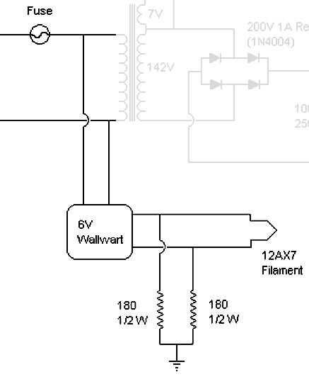 Después de probar varias soluciones, decidí luz sólo los tubos de la energía con el transformador principal y usar un "wallwart" barato para el preamplificador 12AX7. Ahora tiene el preamplificador es fuente propia, "dedicado", éste era muy tranquila, de hecho. La wallwart estaba ya en mano.
