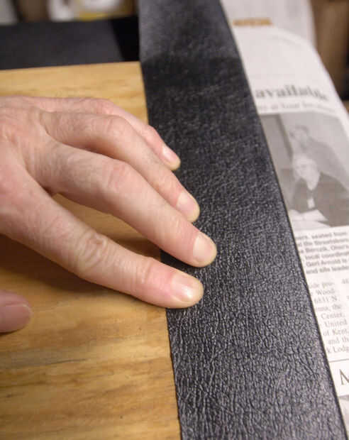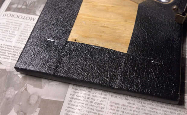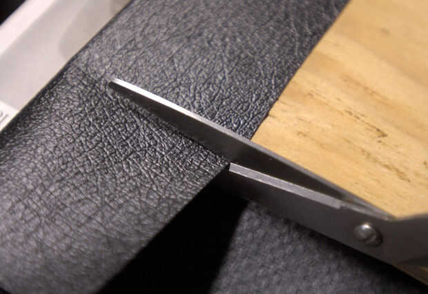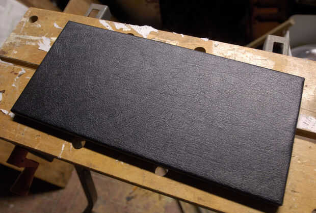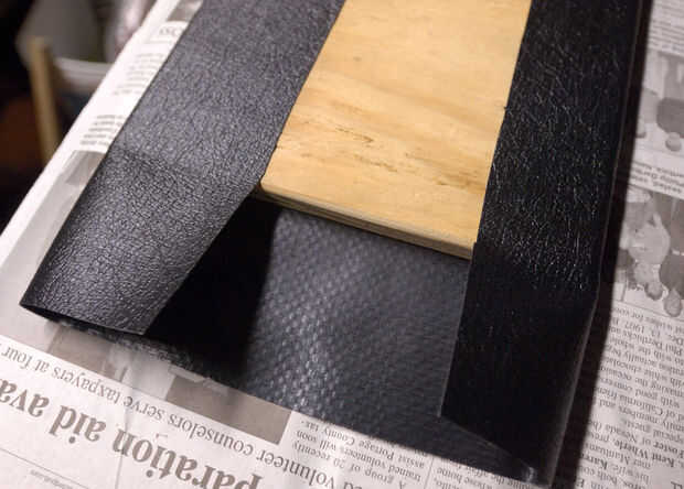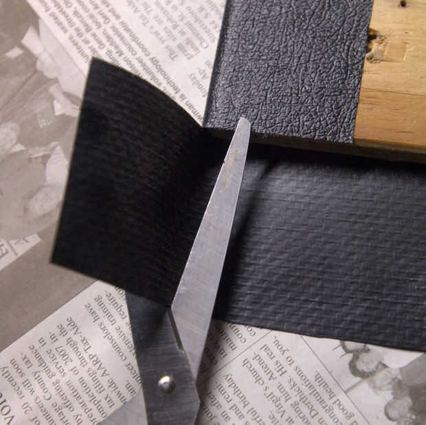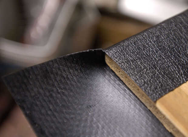--El frente de la pieza, envolviendo el vinilo sobre los bordes y alrededor de la parte posterior del pegamento. Tenga cuidado y evite cualquier reúne, etc.. Para formar la esquina, primero quite el exceso haciendo dos cortes.
