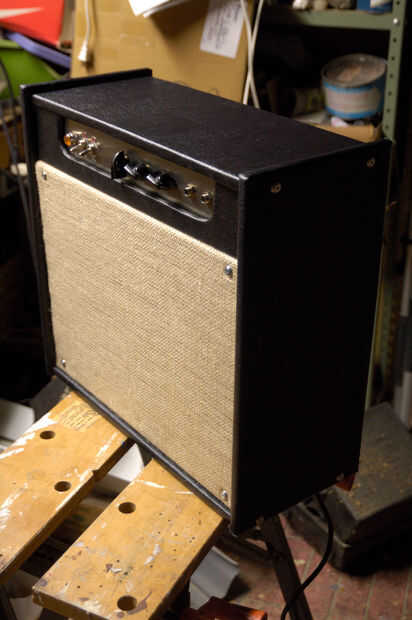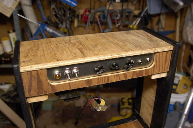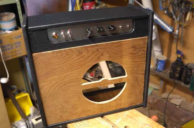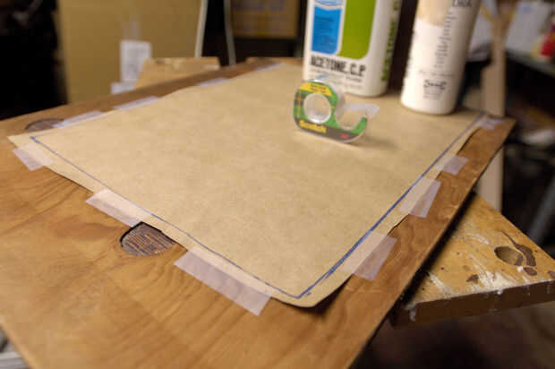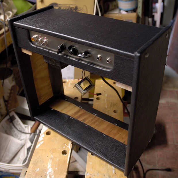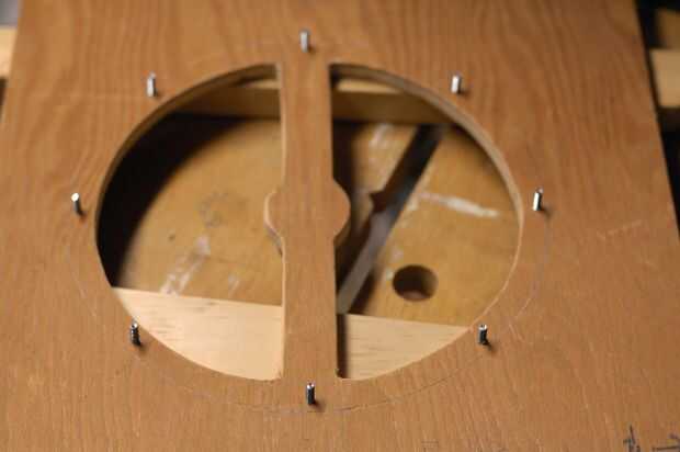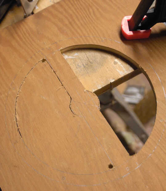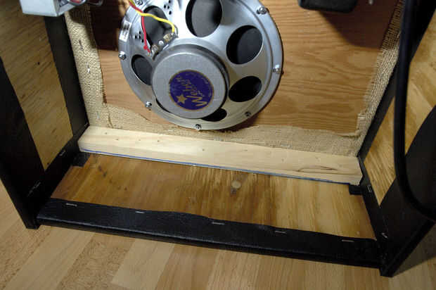 El frente fue cortado de la madera contrachapada de 3/8 pulg con una sierra de sable. Fue remontado en un pedazo de papel de estraza, en caso de que el gabinete no era bastante cuadrado. No remonta directamente, para que un borde más exactamente podría ser alineado con el "filo de fábrica" de la madera contrachapada. El frente es lo suficientemente grande para dar cabida a un altavoz de 10 pulgadas, si lo desea.