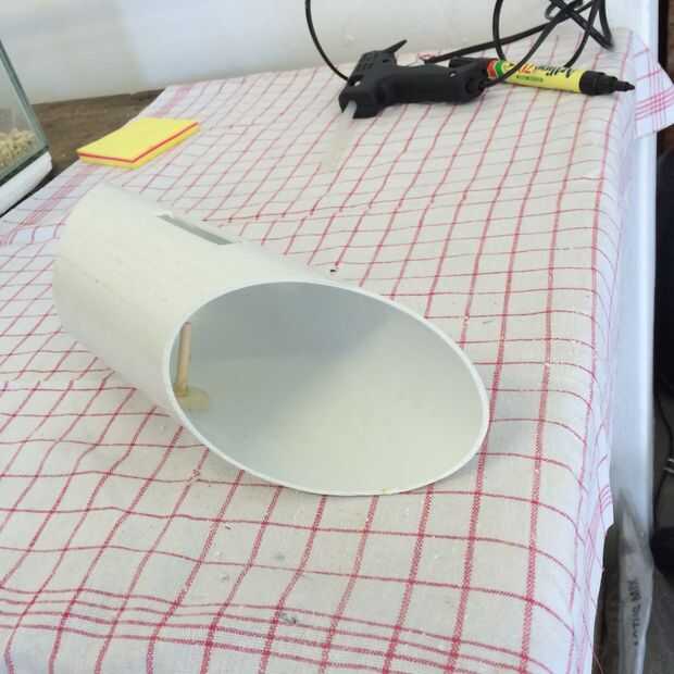 Corte un pequeño palo a cerca de la mitad del diámetro de la tubería. Utilicé un palillo de la tajada. Ahora pegue el palillo abajo directamente debajo de la abertura para el dispositivo. Asegúrese de que está en medio de la apertura.