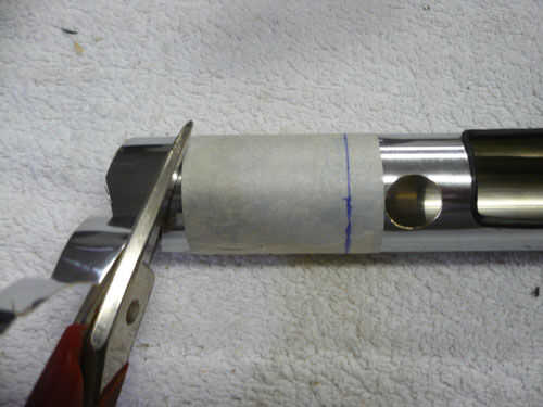 Cubierta con cinta adhesiva y dibujar una línea de 3 cm de la cantera. Corte el material excedente de tijeras. Al final había pulido corte.