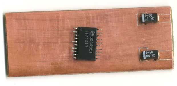 El chip se va a soldar a la placa, pero no islas de aislamiento se cortará para él. La línea de alimentación de + 12 voltios va a ser llevado por una franja de revestido de cobre pegada a esta placa. El resto del cableado se flotando sobre el tablero o pegado a él con pegamento.