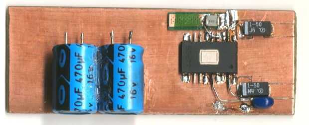 Los capacitores de salida se han pegado a la Junta utilizando pegamento caliente. El carril positivo de la fuente está conectado y desacoplada utilizando un condensador de cerámica de la viruta.