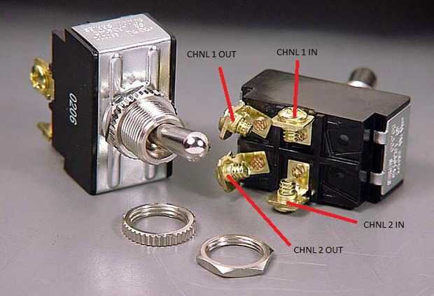 En foto 2 puede ver la parte trasera de un interruptor de 2PST de gran calidad. Usé esto sólo con fines ilustrativos ya que es un poco más fácil ver los contactos pero no necesitas algo tan grande para nuestro proyecto. El cableado es bastante recta hacia adelante. Puede interrumpir un cable a cada altavoz interno y ejecuta a través del interruptor.