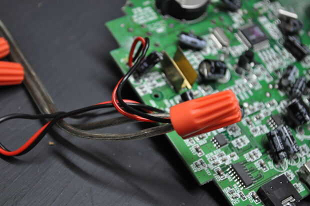Así que estamos hasta la parte fueron que del alambre en el conector de interruptor y el altavoz. Esto requerirá de soldadura. Si no tiene equipos de soldadura o prefieren no tratar con eso, puedes llevar los cables del altavoz derecho hacia la parte posterior de la unidad y omitir este paso. Se verá mucho mejor y duran más tiempo aunque si se hace con un interruptor y altavoz conectores. Fig 5 muestra cómo extender los cables del altavoz sin soldaduras y cortar sólo una muesca en el caso de llevar a cabo.
