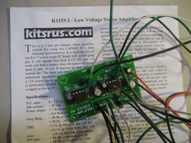 Construir el amplificador estéreo según las instrucciones. La excepción no es el potenciómetro de volumen a la Junta de la soldadura. También hay pins de conexión de oro que pueden ser excluidas. En cambio, se soldar los cables directamente a la Junta durante el montaje final. Sin embargo, se recomienda conectar temporalmente el bote para probar el circuito.