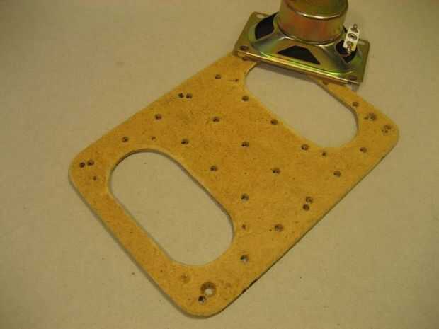 A continuación, utilizando el mismo patrón, transferir a la Junta de masonite. Recortar con una sierra caladora de dientes finos. Coloque el altavoz y el amplificador en el board de masonite y marque sus posiciones. Asegúrese de que dejar espacio para el potenciómetro de volumen también. Recorte los agujeros para los altavoces. Taladrar y avellanar los agujeros para los altavoces. Taladrar y avellanar los agujeros para el amp y la olla.