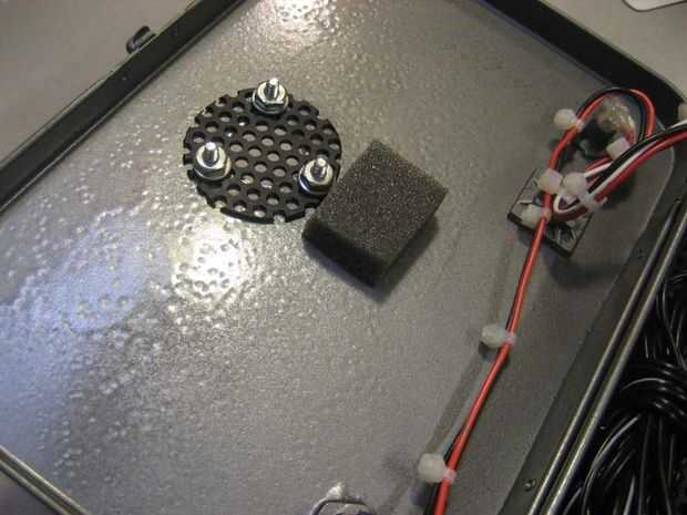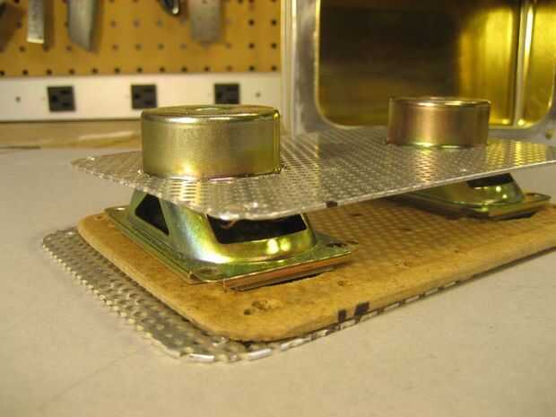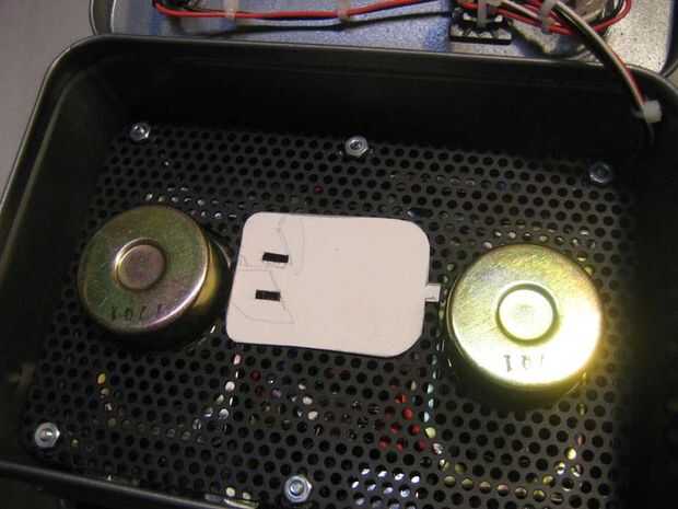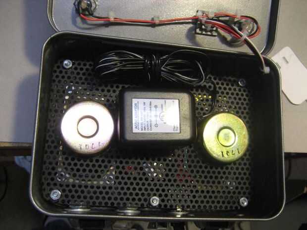 Ahora es el momento para el transformador de energía en el área del compartimiento de la caja. Temporalmente Instale el chasis entero incluyendo los altavoces. Cada transformadores de 12VDC difieren en tamaño. Encontrar un lugar dentro del compartimento donde no interfieren con otros componentes. El transformador de energía en esta compilación era demasiado grande para caber dentro del compartimiento. Por lo tanto, era decidido para colocar el transformador con la cara de dientes hacia abajo. Esto significó que las ranuras de acceso tuvieron que ser cortado en la hoja de aluminio perforada.