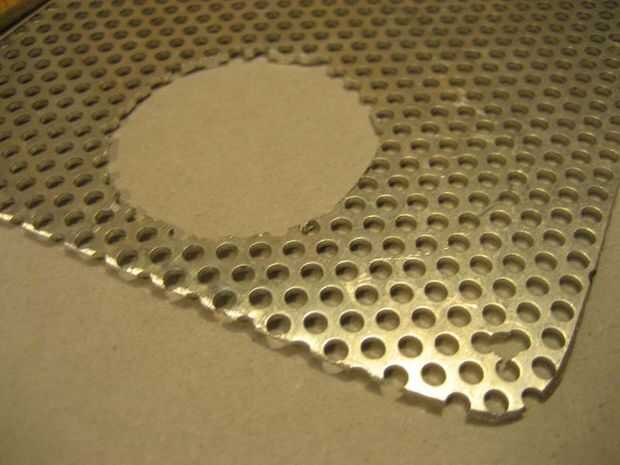 Desde el interior de la caja, coloque una hoja de papel y traza un patrón para la rejilla del altavoz. Transferir el patrón de la hoja de aluminio perforada. La hoja de aluminio es suave así que tijeras pueden ser utilizadas para cortar hacia fuera.