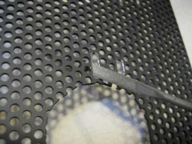 En primer lugar, crear una plantilla de la cara del transformador entre las ranuras de los dientes. Localizar y transferir la plantilla para el divisor de compartimiento de aluminio perforado. Asegúrese de que habrá suficiente espacio alrededor de la transferencia cuando se instalan todos los componentes. Marque el aluminio perforado donde se ubicarán las ranuras. Utilice un pequeño archivo para alargar los agujeros.