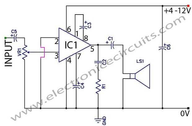 El LM386 es un amplificador de audio de bajo voltaje. Puede proporcionar 125mW a 750mW, suficiente para cualquier proyecto que utiliza audio. Este circuito puede funcionar con baterías, requiere mínimo partes externas y trabajos de 4 a 18 voltios (en