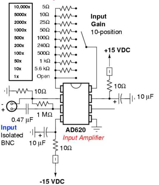 Nuestro primer paso es construir el amplificador de entrada. Este componente le llevará en nuestra señal y amplificar el voltaje, dependiendo de la resistencia de ganancia variable. El amplificador trabaja simplemente a través de un op-amp no invertir. Para este componente, potencia con los +-15V de alimentación con filtros low-pass conectado a cada fuente para filtrar ruidos de circulación/no deseados. Las funciones de condensador de disco para evitar cualquier fluctuaciones en la señal al realizar la demodulations más adelante por el camino. PIN 6 se salida del demodulador de señal.