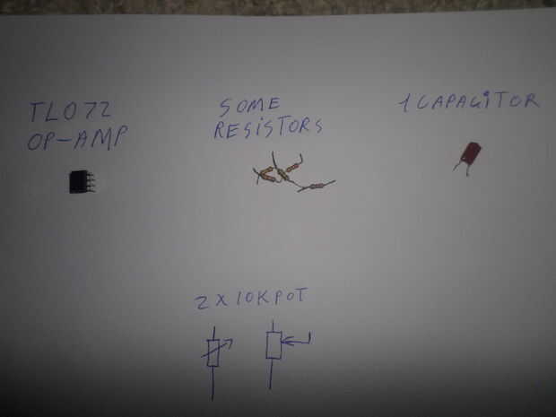 1: soldador 2:SOLDER 3: habilidades (no tanto) de soldadura 4:perfboard 5:Tl072 op-amp 6: algunas resistencias 2x100k, 2x10k, 1x1k 7:2 condensador 1x1nf, 1x470nf (esto es para la modulación de audio) 8:2 x 10 k potenciómetro