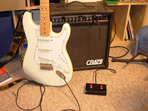 Mientras que mirando mi amp del manual, vi que la etiqueta para el conector de pedal footswitch señala las funciones de los TRS (Tip-Ring-Sleeve, o estéreo) que se enchufe a la toma. Fue entonces que tuve la idea de que debo hacer un pedal en vez de comprar uno, al igual que haría cualquier geek que se precie.