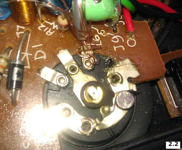 En potenciómetro tratar de la radio de empujar los alambres expuestos de debajo de la lengüeta metálica y envolver. Después de envolver el alambre alrededor de caliente pegamento o soldadura de alambre en su lugar. Ver img 2.2