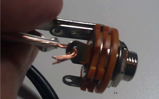 Doble el cable de uno de los bordes y gancho a través de los agujeros de la conector de 1/4" y pegamento caliente o suelde el cable en su lugar. Ver img 1.1 anterior.