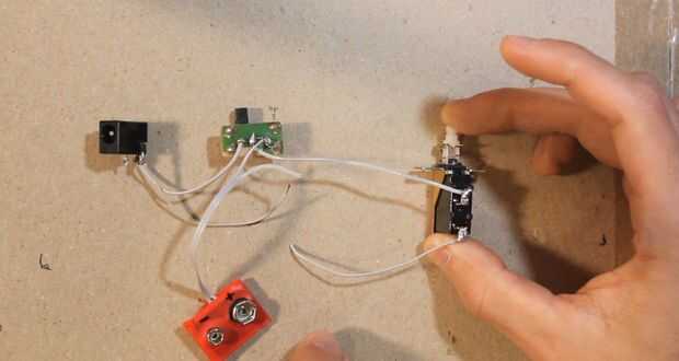 Puesto que nuestro amplificador puede ser alimentado por una batería de 9V o de DC jack, necesitamos un mecanismo que desconecta la fuente de alimentación de la batería una vez ha sido enchufado un DC jack.
