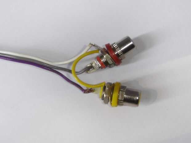 Primer cable a tierra (blanco) está conectado a tierra del circuito de amplificador de salida. Hilo violeta está conectado a la salida izquierda del circuito amplificador y cable marrón se conecta a la salida derecha del circuito amplificador. Después de la conexión firmemente los pernos de RC.